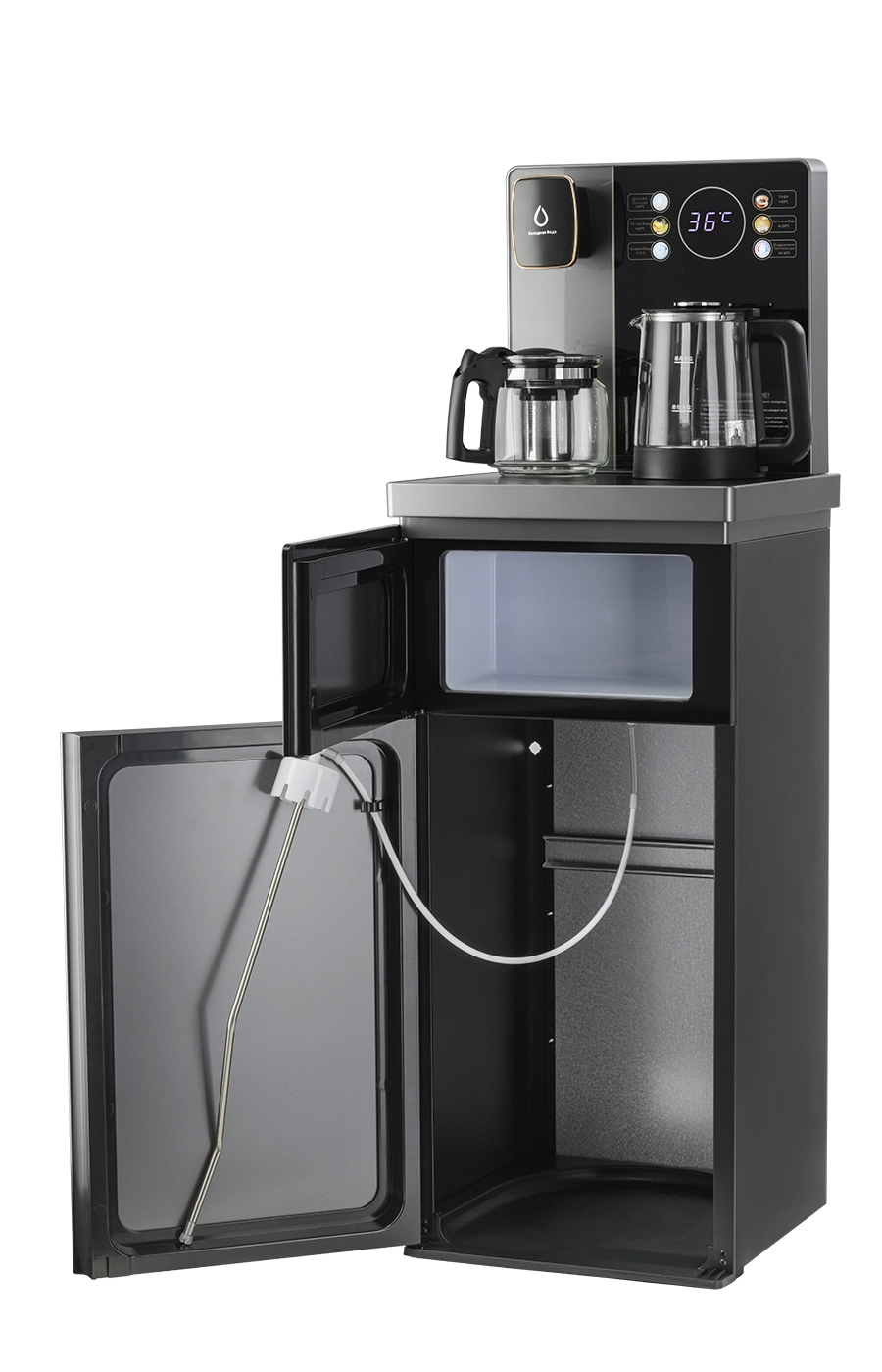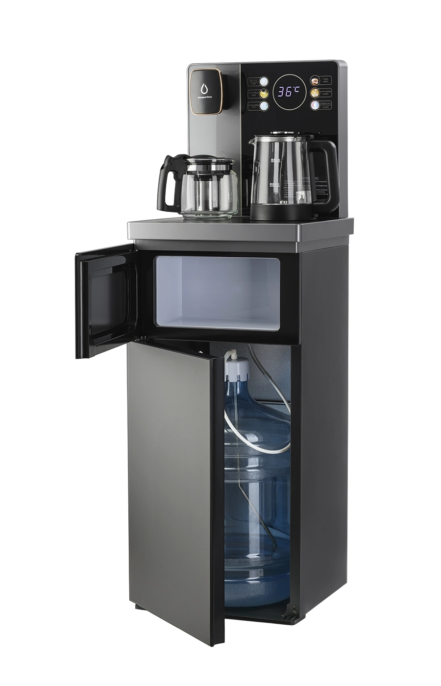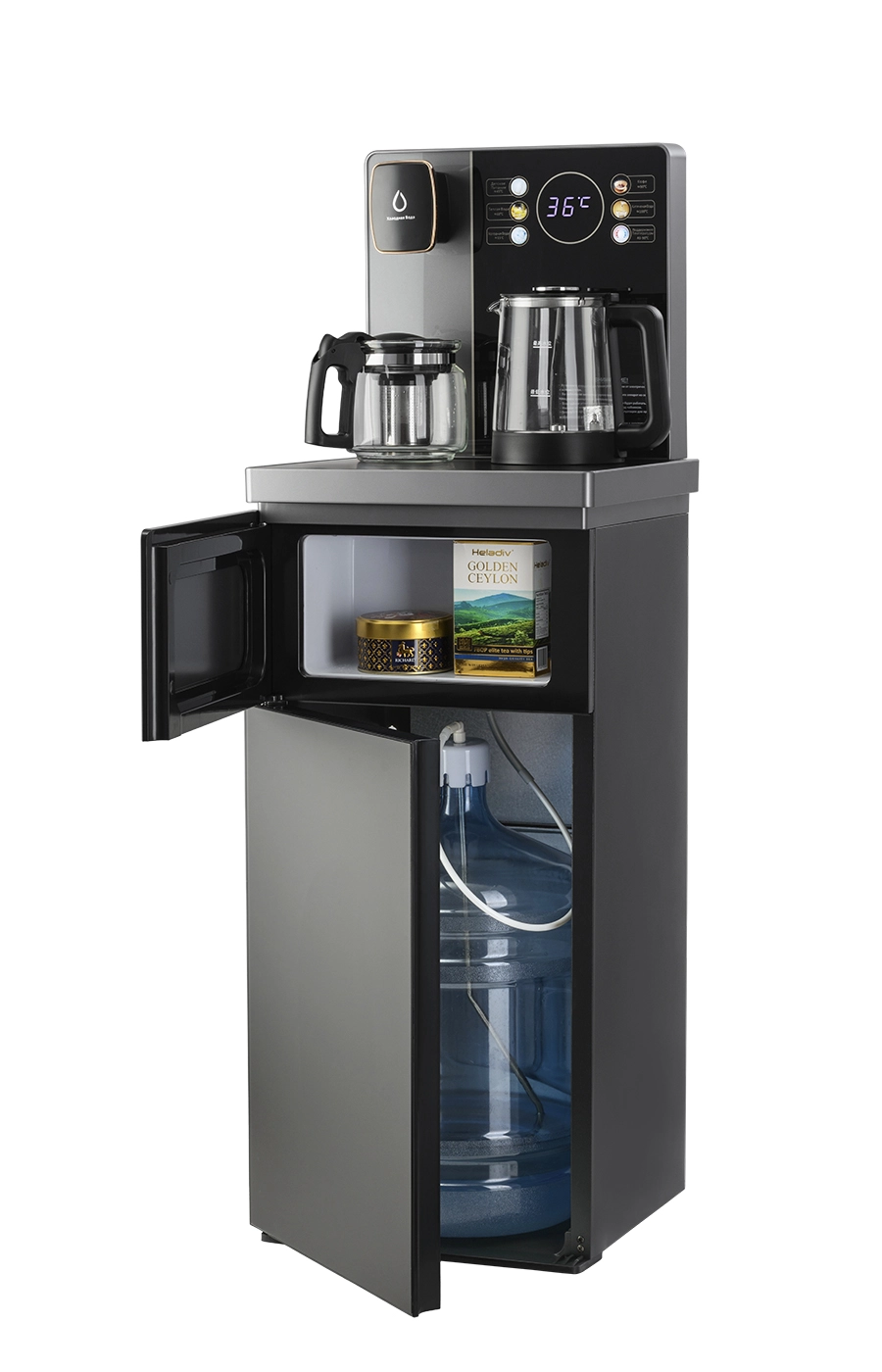 Чайный столик серого цвета TB83a-LD с электронным охлаждением. Нижняя загрузка бутыли. Управление с помощью сенсорной панели управления и сенсорных кнопок на столешнице. Шесть режимов нагрева воды, маркированные температурой: 45°С для детской молочной смеси, теплая вода 60°С, холодная вода 15°С, 90°С для кофе, 100°С кипяток, и функция поддержания температуры 40°-90°С. Уникальная система залива воды непосредственно в чайник снизу через клапан в столешнице. Функция подогрева. Чайники объемом 1л, Размер в собранном виде 370 x 340 x 1125мм. Высота до чайников 88,5 см. Размер электрического чайника: D -14 см, высота - 17,2 см. Размер стеклянного чайника: D -12,5см, высота - 13 см
